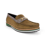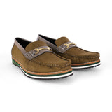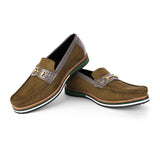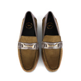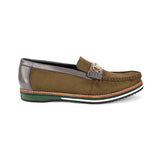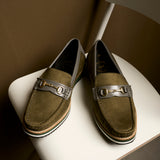 Step into a new league of style and comfort with these uniquely designed olive suede loafers. Featuring smooth grey panels and an elegant metallic buckle, these shoes bring a refined yet modern vibe. What truly sets them apart is the bold multi-tone sole, crafted for superior cushioning and eye-catching contrast. Whether you're dressing up for a semi-formal day or elevating your smart-casual wardrobe, these loafers deliver all-day ease with standout flair — a rare blend of character and comfort you won’t come across every day.
